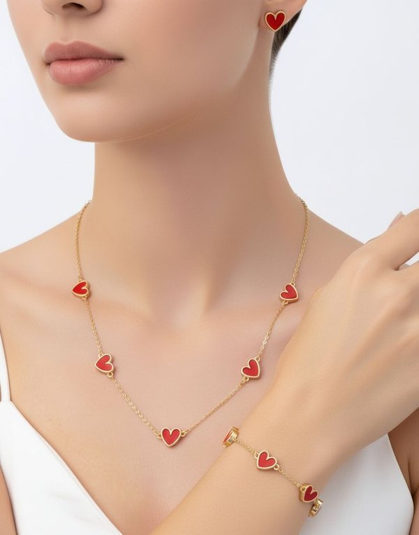 Set elegante de 4 piezas bijou con collar, pulsera y aros en forma de corazón, en tonos dorado y rojo, ideal para usar todos los días o regalar en ocasiones especiales.