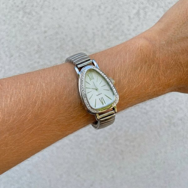 Reloj tipo pulsera diseñado en acero inoxidable con un sofisticado acabado plateado. Su esfera blanca y el bisel decorado con cristales ofrecen un estilo luminoso y versátil. La correa metálica flexible asegura un ajuste cómodo y firme, convirtiéndolo en la pieza ideal para quienes buscan elegancia y durabilidad en un solo accesorio.